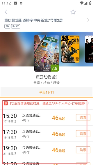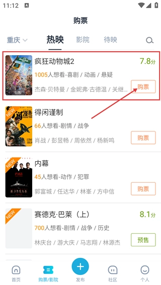 进入购票页面后,找到《疯狂动物城2》的影片条目,点击其右侧的【购票】按钮,即可进入该影片的影院选择界面。