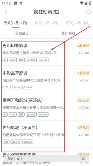 在影院选择界面,选定【巴山印象影城】后,就能查看该影院的地址、影厅特效类型以及对应的票价信息。