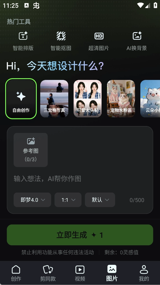 打开“图片”版本,借助AI绘画功能输入创意构思,选定合适的模型与比例,即可生成三宫格写真、宠物水彩画这类风格鲜明的作品。