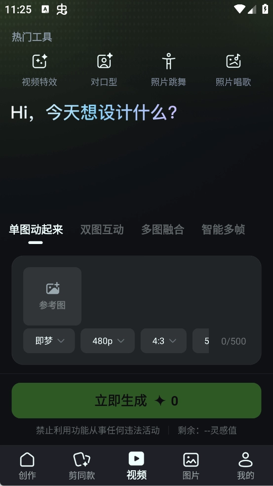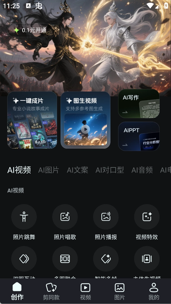打开App的创作页面,你可以一键生成完整视频,也能把图片转化为视频,更有照片跳舞、唱歌等AI视频功能,让静态的素材轻松“活”起来。