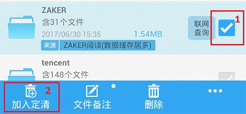 在“存储文件分析”页面,勾选要定期清理的文件(夹),然后点击“加入定清”即可。