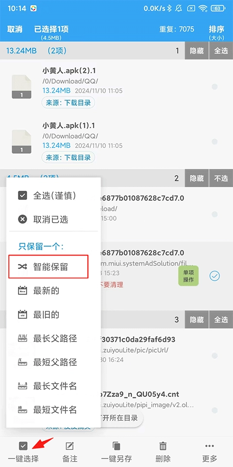 手机使用久了,会产生非常多的重复文件。同样,在清理前,确保重要文件是已做好了“不要清理”的备注,以防误删。(玩游戏的用户,如果存放游戏数据的目录在存储的文件中,建议也备注为“不要清理”,以免误删导致游戏异常)