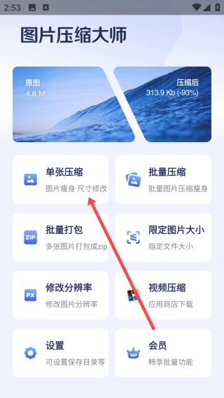 1、打开图片压缩大师,点击【单张压缩】。