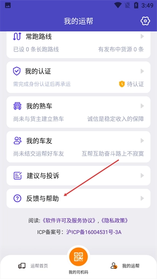 2、进入【我的运帮】页面,点击【反馈与帮助】。