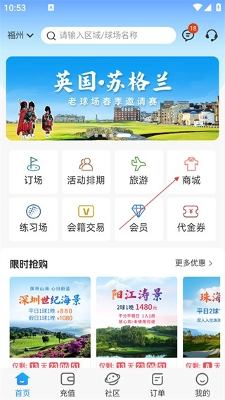 1、在软件首页,找到【商城】功能入口,点击进入可浏览各类高尔夫商品分类。