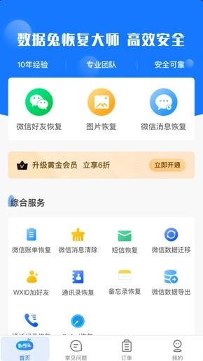 打开后进入主界面,在这个界面里就能挑选需要恢复的数据(涵盖微信好友恢复、图片恢复、微信消息恢复、微信账单恢复、短信恢复、通讯录恢复等功能)。