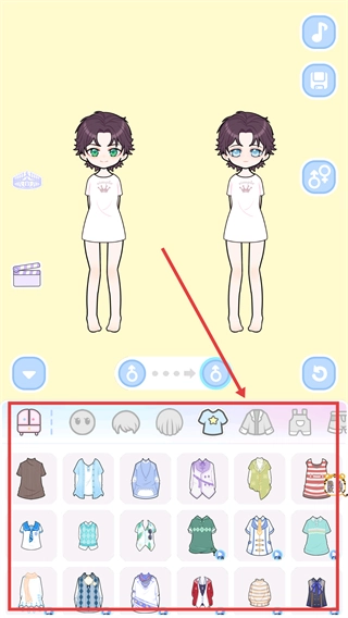 切换至底部的上衣装扮栏,挑选喜欢的服饰(比如条纹上衣),点击该服饰就能直接为角色更换上衣造型。