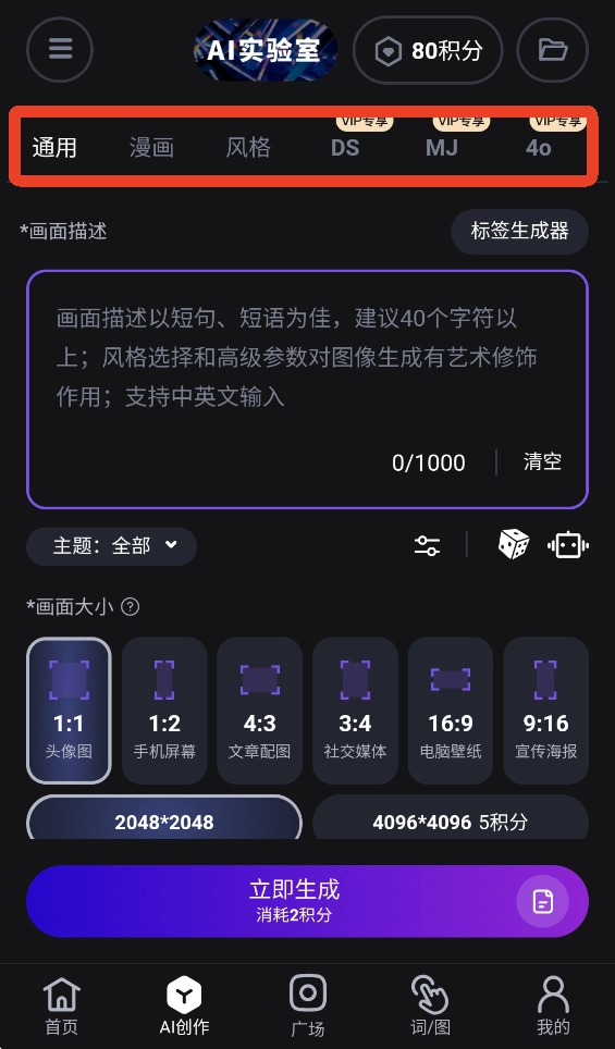 1、进入软件后,点击下方【AI创作】,你可以选择通用、漫画和风格等类型,创作AI图片需要消耗积分。