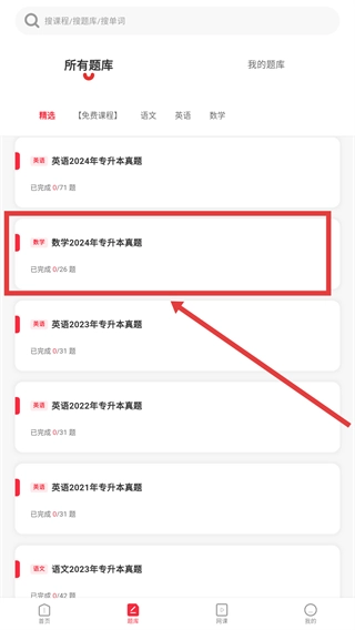 在【所有题库】页面,挑选目标学科的真题(例如【数学2024年专升本真题】),然后进入这套真题的练习界面。