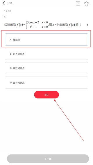 在真题答题界面,选择对应的选项(比如这道题选A),点击【提交】按钮,就能完成这道题的作答并查看结果。
