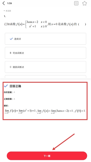 答题结果显示【回答正确】后,可查看解析内容,接着点击【下一题】按钮,继续完成剩余题目的练习。