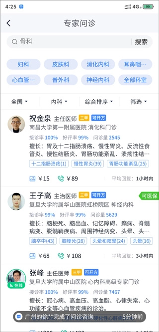 2、接着在“专家问诊”页面里,完成地区和科室的选择