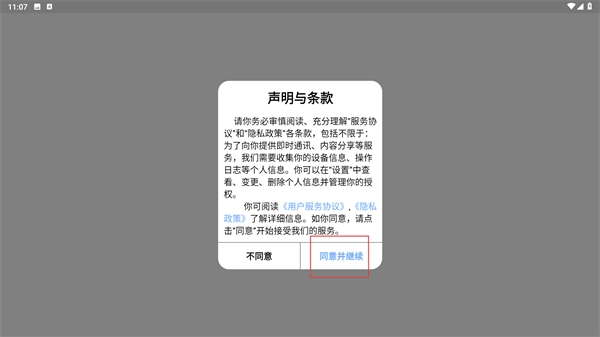 在仔细阅读【声明与条款】中的服务协议以及隐私政策后,请点击【同意并继续】按钮,以便进入系统后续的操作流程。