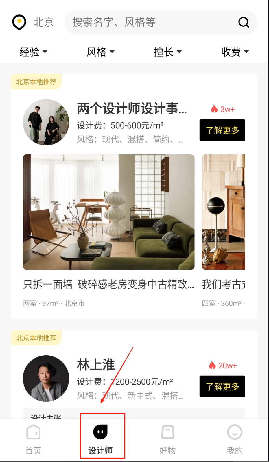 可以按照“设计”的风格分类来对接专业人员,浏览他们的作品集,还能在线沟通具体需求。