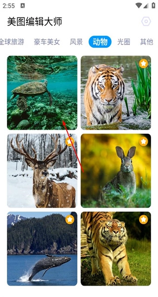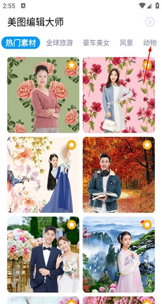 打开美图编辑大师进入首页,浏览热门素材分类标签,点击动物标签切换至对应的素材列表。