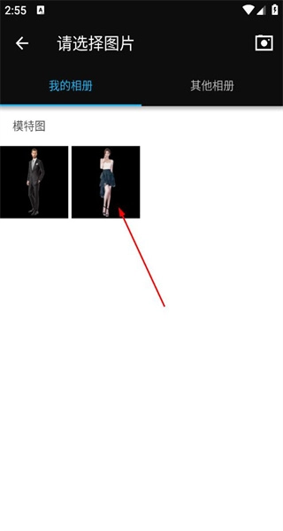 在图片选择页面,浏览我的相册中的模特图片,挑选对应的模特图进入素材编辑界面。