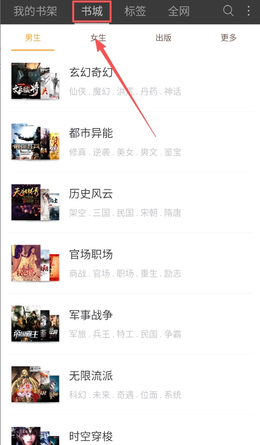 找书可以重点参考两个途径:一是通过“书城”按大类别挑选,二是利用“标签”页进行精准筛选。标签页里的男生、女生分区设计得挺实用的。