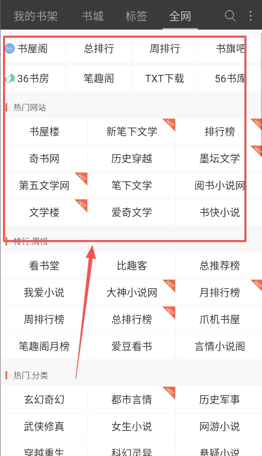 借助“全网”页面的聚合功能,这里不仅能直达36书房等资源站,还能参考总排行、月排行等各类榜单,就像是整合了多个找书渠道的便捷入口。