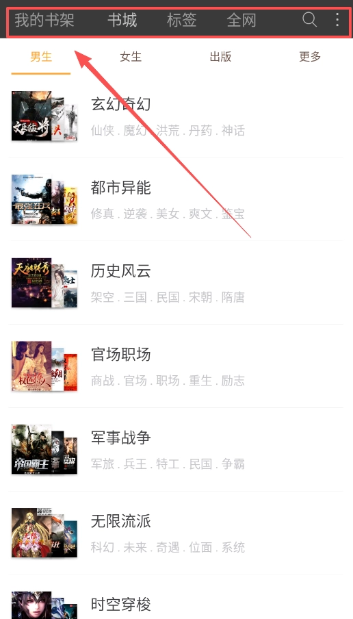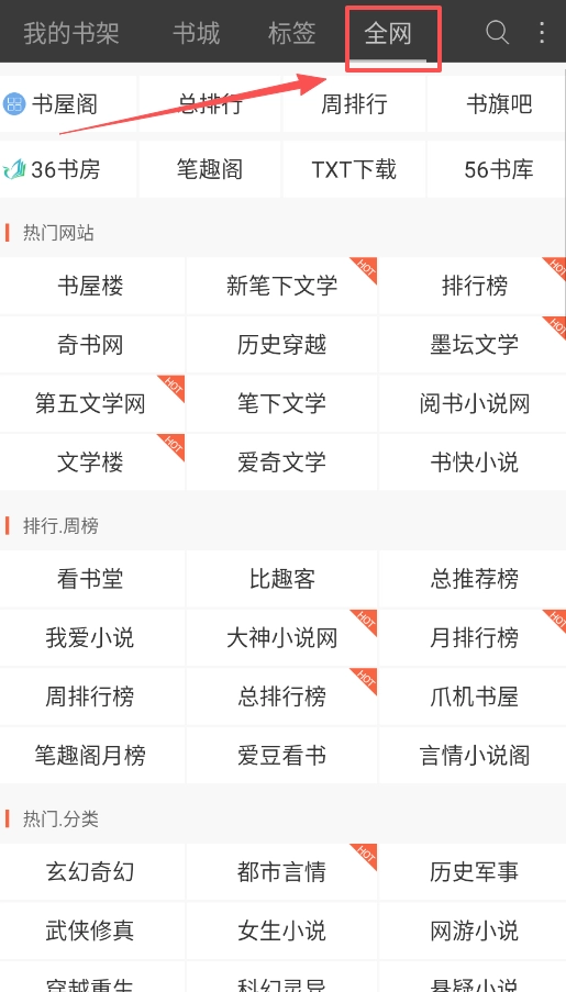 主界面底部的导航栏包含“书架”“书城”“标签”“全网”这几个选项。若要寻找书籍,建议先选择“书城”这个大类,之后再从中挑选“历史风云”等具体的分类。