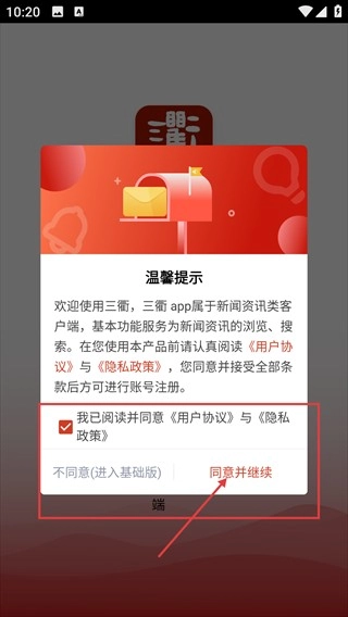 进入【三衢】后,勾选已同意【用户协议】和【隐私政策】,点击【同意并继续】按钮,就能进入软件开始准备账号注册流程。