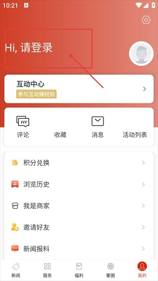 进入【我的】页面后,会看到【Hi,请登录】的提示语,该页面还设有【互动中心】【评论】等功能入口,点击登录相关区域即可开启登录流程。
