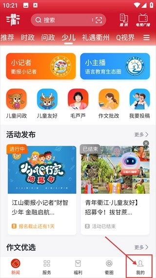 进入【三衢】首页后,能查看【小记者】【小主播】等功能板块,点击页面底部的【我的】按钮,即可进入个人中心界面。