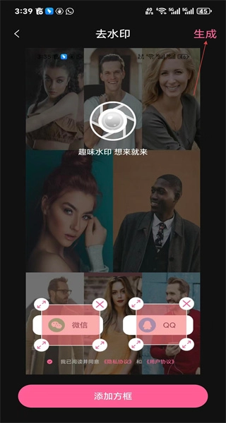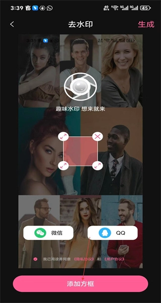 先框选出水印所在的区域,接着点击生成按钮,然后耐心等待软件完成去水印的处理步骤。