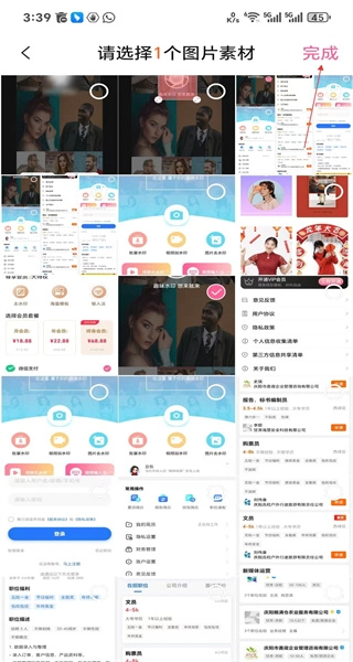 打开去水印应用,进入图片素材选择界面,浏览不同类型的图片,选定目标素材后点击完成按钮,即可进入处理页面。