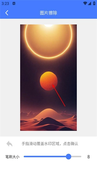 进入图片擦除界面,查看需要处理的图片,拖动笔刷大小的滑块,把尺寸从1调整到合适的数值。