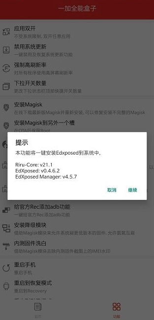 点击「一键安装EdXposed」按钮即可自动完成安装流程,重启设备后相关设置将正式生效。