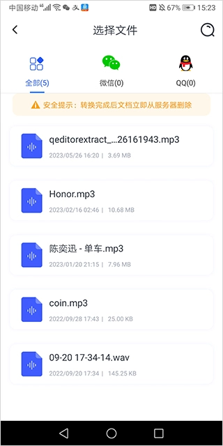 只需把手机里的音频文件,或是微信、QQ中的音频文件上传就可以了。
