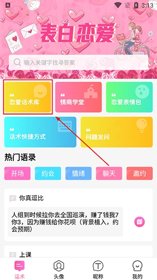 进入土味情话,点击首页的【恋爱话术库】