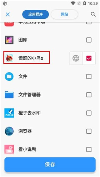 这里我们拿“愤怒的小鸟2”来举例,选定之后点击下方的【保存】按钮。