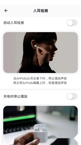 支持耳机的入耳检测功能,能够达成与iPhone上一致的使用效果,即耳机入耳时自动开始播放,取出时则暂停播放。