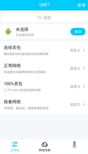 在“工作台”页面,点击“点击选择应用”,选择您想要进行弱网测试的应用。