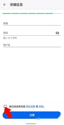 在填写好相关资料后,会进入到最后一步,这一步需要填写邮箱、密码和用户名。完成这些信息的填写后,点击下方的“我同意相应条款”,最后点击注册按钮,就能进入应用了。