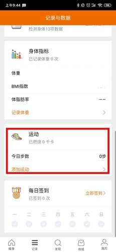 在记录界面向下滑动,就能看到一个【运动】栏目板块,这里会显示我们的步数,点击今日步数即可。