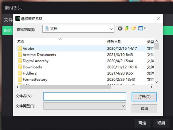 若素材存放位置与原电脑不一致,系统会弹出素材替换窗口,此时点击缺失的素材,找到之前和jpro一起复制过来的素材进行替换即可。