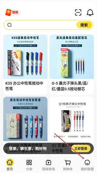 1、打开软件,在首页通过搜索栏搜索或直接浏览找到心仪商品,如【K35办公中性笔按动中性笔】。