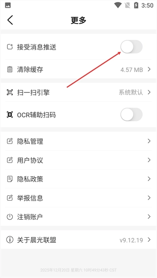 3、在“更多”设置页面中,找到“接受消息推送”对应的开关选项。