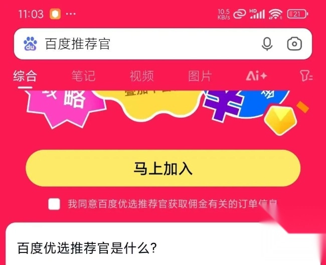 打开百度App,在搜索框输入“百度推荐官”,点击搜索结果里的“马上加入”按钮,就能进入百度推荐官活动页面。