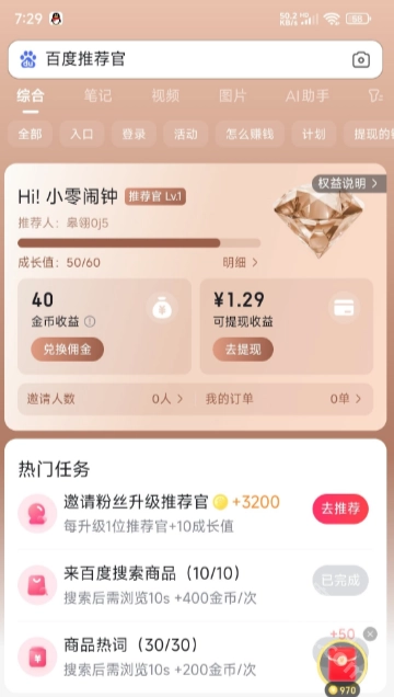 百度推荐官本质上就是百度官方推出的一项活动,用户参与该活动后,能通过完成搜索任务、邀请好友等途径获取金币奖励,而这些金币是可以兑换成现金的。这一活动既能让用户赚到零花钱,又能为商家带来流量。