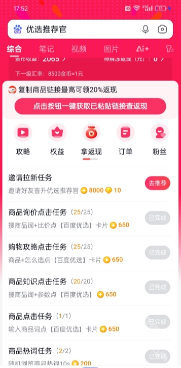 完成5次搜索任务后,系统会自动把您升级为正式的百度推荐官,开启更多任务和奖励的解锁权限。