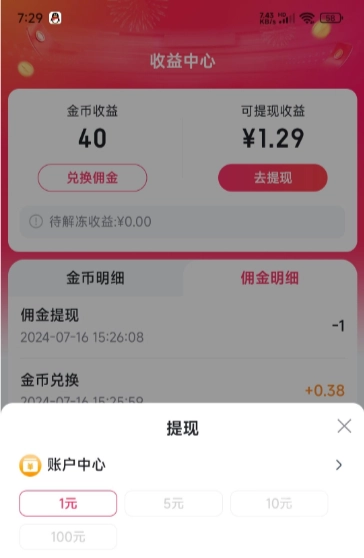 当金币积累到一定数量时,就能兑换成现金啦,只要满1.00元就可以提现到支付宝,而且提现操作很简单,还能秒到账。