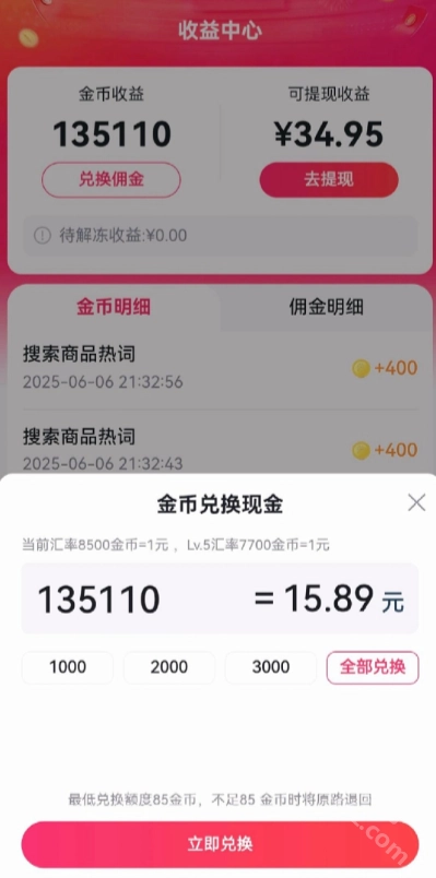 -随着等级的提升,金币兑换现金的比例会降低,例如Lv1推荐官需要16000金币兑换1元,而Lv4推荐官仅需8500金币兑换1元。