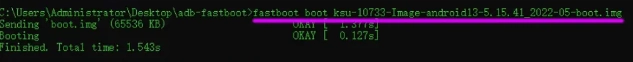 六、临时通过boot命令启动,测试内核文件是否可以正常开机(重启后相关设置会失效,若确认刷入后能正常开机,该步骤可跳过)。请注意,联发科设备无法通过fastboot boot命令来临时启动内核文件。