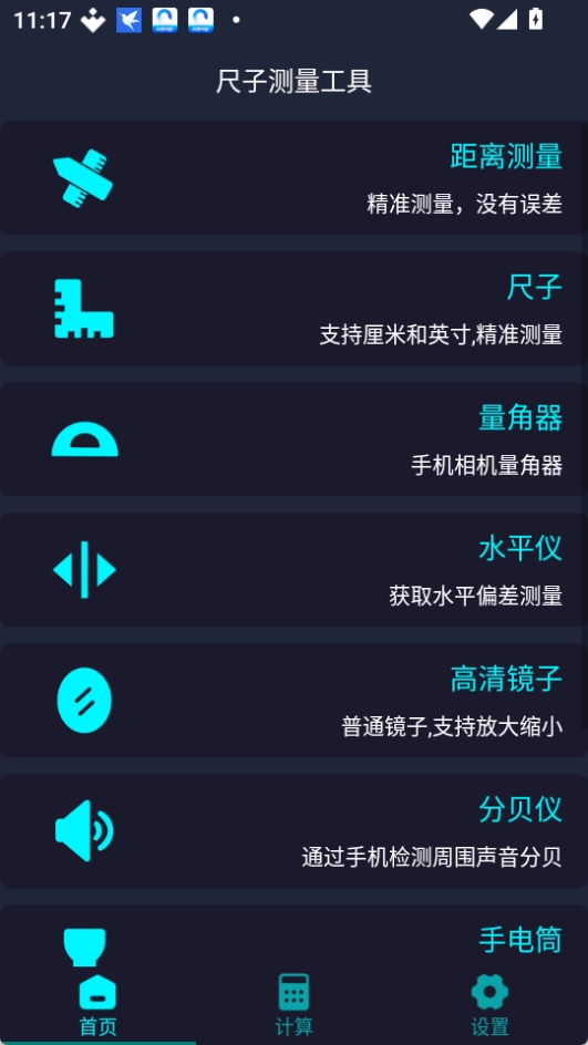 尺子电子版是一款集成多种实用功能的测量工具,涵盖距离测量、尺子、量角器、水平仪、高清镜子、分贝仪、手电筒,以及汇率转换、大写数字转换、亲戚称呼计算、日期计算、进制转换、万能公式等功能模块。其中尺子功能支持厘米与英寸两种单位,可实现精准测量;量角器功能可借助手机相机进行角度测量;高清镜子功能还具备放大和缩小的操作选项。