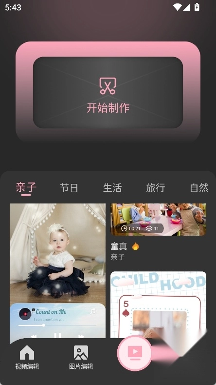视频制作提供多样免费模版,包括生活、旅行等素材。