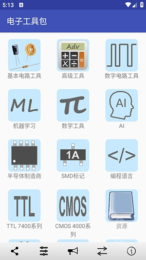 电子工具包是一款功能丰富的多功能电工办公辅助神器。这款安卓版电子工具包整合了电阻色码、LED电阻计算器、分压器等多种实用工具。借助它的协助,能为大家提供精准支持,有效提升工作效率,堪称电子技术领域的得力伙伴!