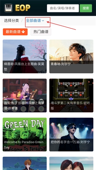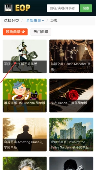 进入【EOP】界面后,你可以通过顶部的搜索框搜索曲名,也能点击【全部曲谱】来浏览曲库,还可以切换到【最新曲谱】或【热门曲谱】查看相应内容。